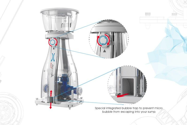 L’élégance et le raffinement de l’Aeraqua Duo ont été obtenus grâce à plusieurs idées ingénieuses comme celle de dissimuler le silencieux d’air dans la plaque de base de l’écumeur, d’intégrer les tuyaux à air et la molette de réglage du niveau d’eau au corps de l’écumeur. Cette dernière particularité permet de régler facilement et avec précision le niveau d’eau dans l’écumeur.