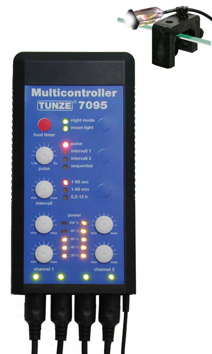 Le Multicontroller TUNZE® 7095 est un Controller à plusieurs canaux pour toutes les pompes Turbelle® avec moteur électronique, simulant en aquarium les différentes conditions de brassage du milieu marin. Il possède une simulation de phase lunaire sur 29 jours et peut piloter jusqu’à 8 pompes. Sa surface d’utilisation digitale résistant à l’eau, avec boutons tournants, permet une utilisation pratique et précise. La puissance des différentes pompes est matérialisée sur un Display LED de 30% à 100%, toutes les sorties de pompes sont situées en partie inférieure de l’appareil. Lors d’une coupure d’alimentation, les derniers réglages en cours restent en mémoire. Au rétablissement de l’alimentation, le programme du Multicontroller poursuit son cycle.